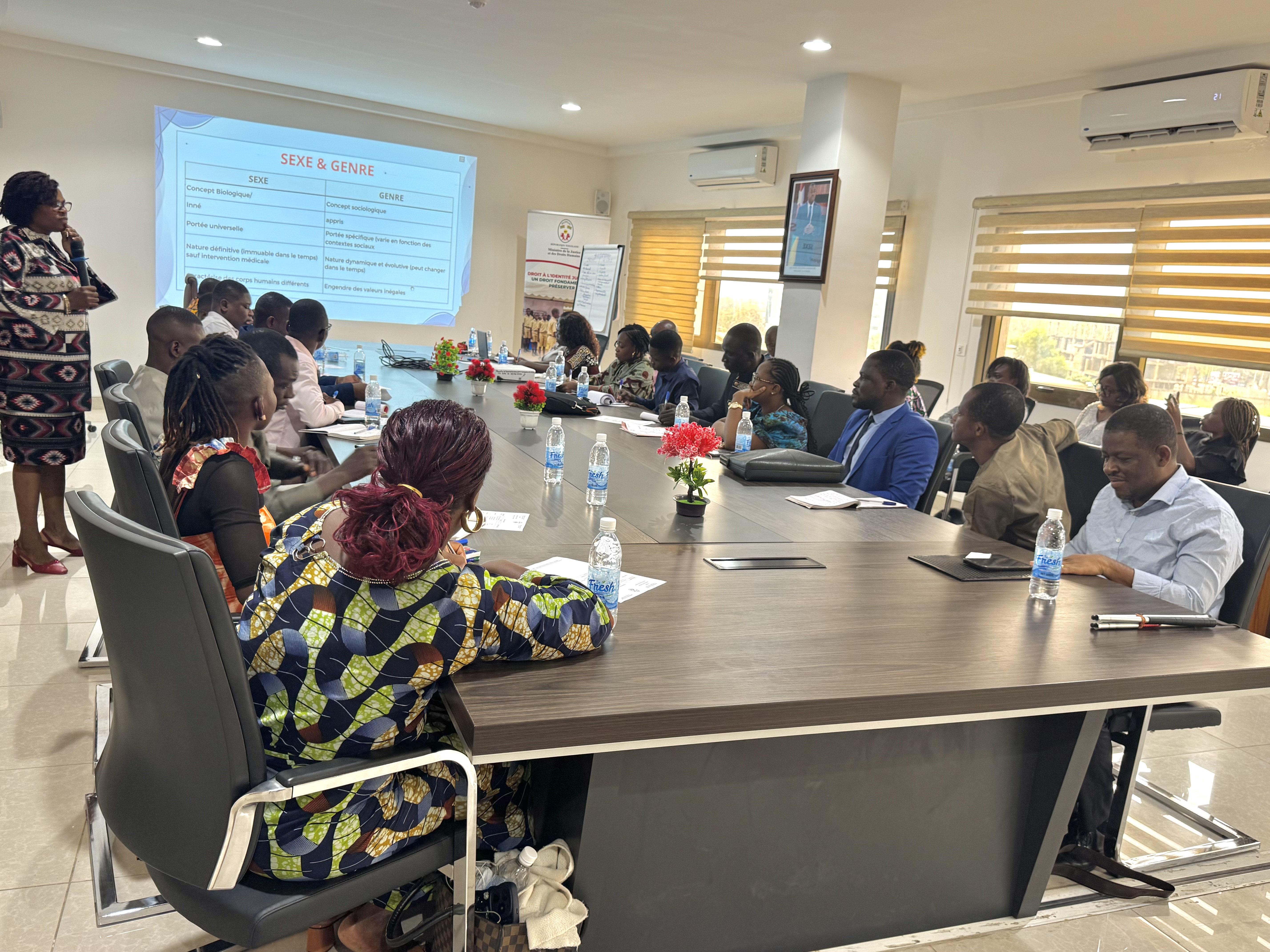 Pour permettre une meilleure appropriation du sujet par les participants, deux modules ont été dispensés. Le premier, consacré à l’introduction au genre et aux notions connexes, a reposé sur des travaux de groupe permettant d’explorer les perceptions liées aux rôles sociaux, au sexe et au genre. Le second module a porté sur l’intégration de l’approche genre dans les actions du ministère et a rappelé les obligations juridiques et institutionnelles issues des textes nationaux et des conventions internationales. Lesdits modules, présentés par Madame HOUNYO Afi, membre de la Cellule Focale Genre, cheffe division à la direction de la législation et de la protection des droits de l’Homme.